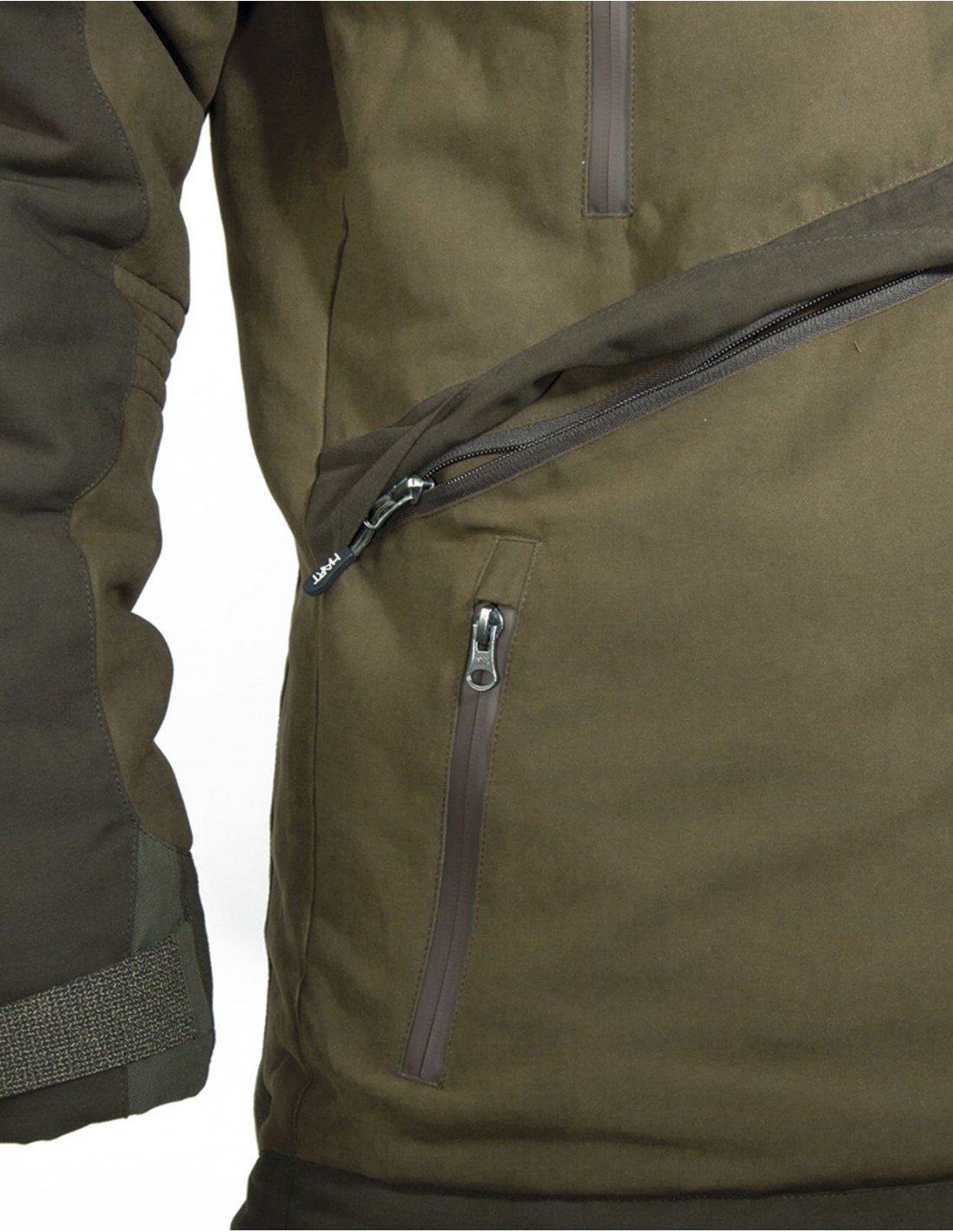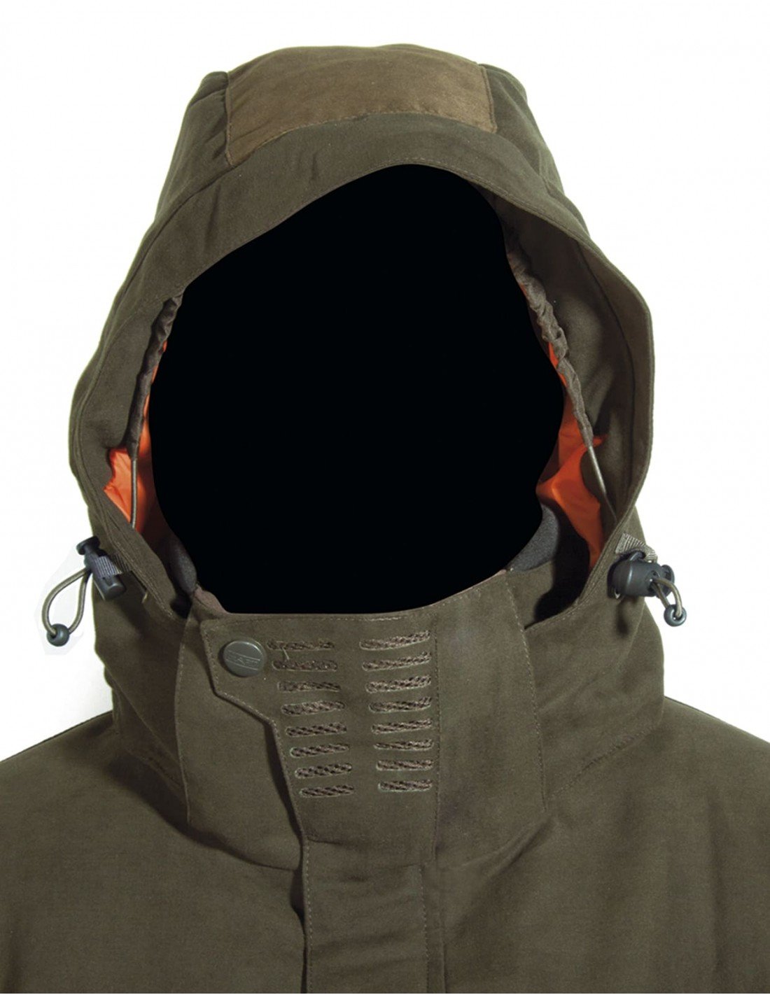Two combined zippered cargo pockets with side access, long warming chest pockets, and 3 inner pockets (including a large pocket for hood storage and a pocket with a media port). Removable hood with adjustment options. Suitable for both everyday use and hunting in cold conditions.