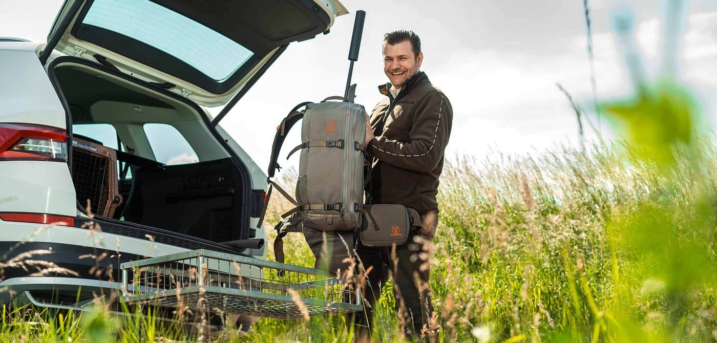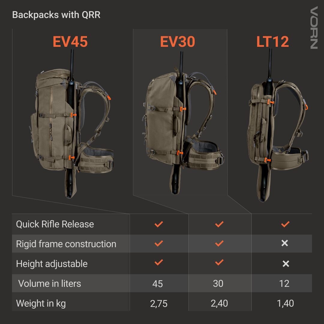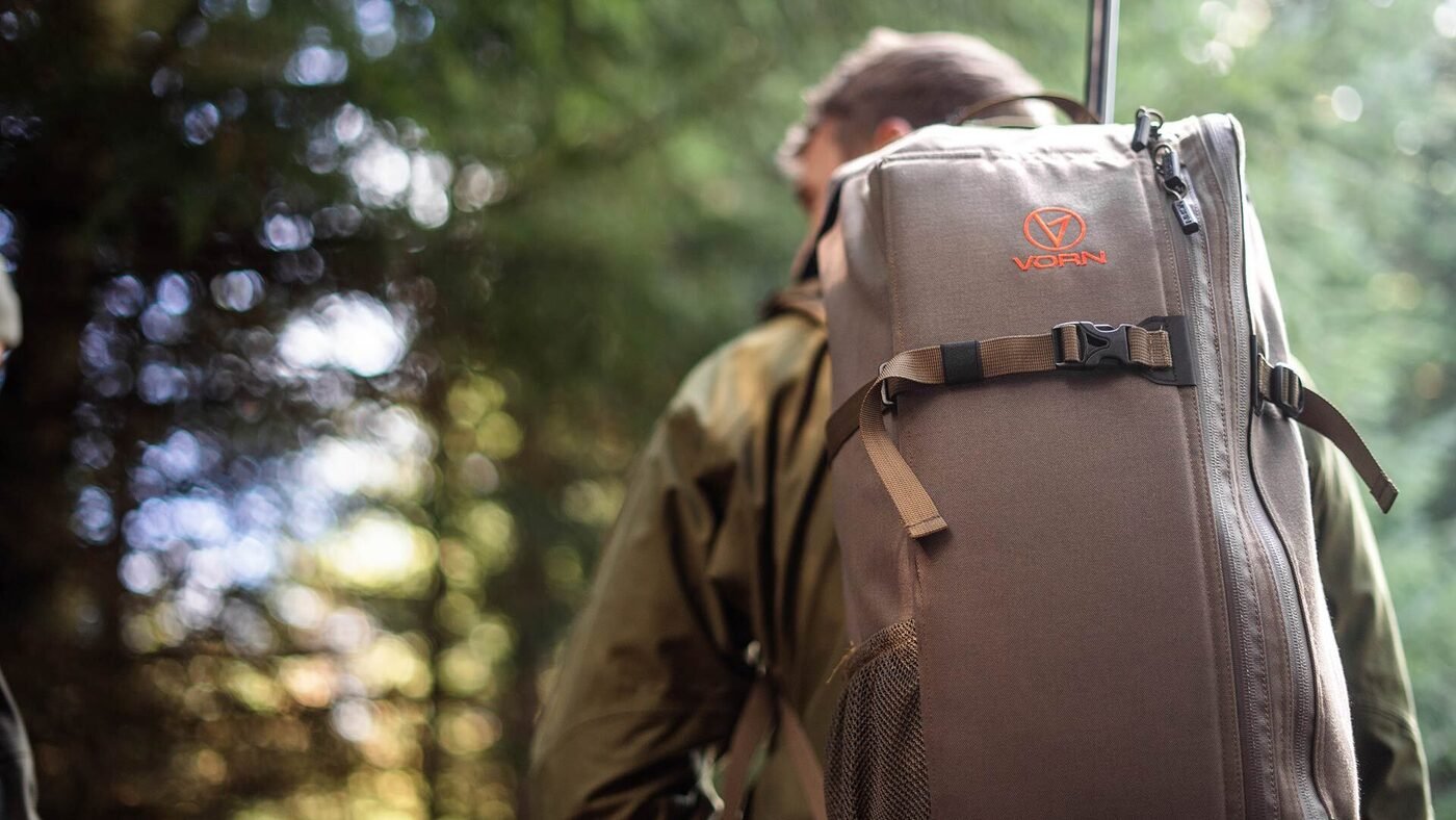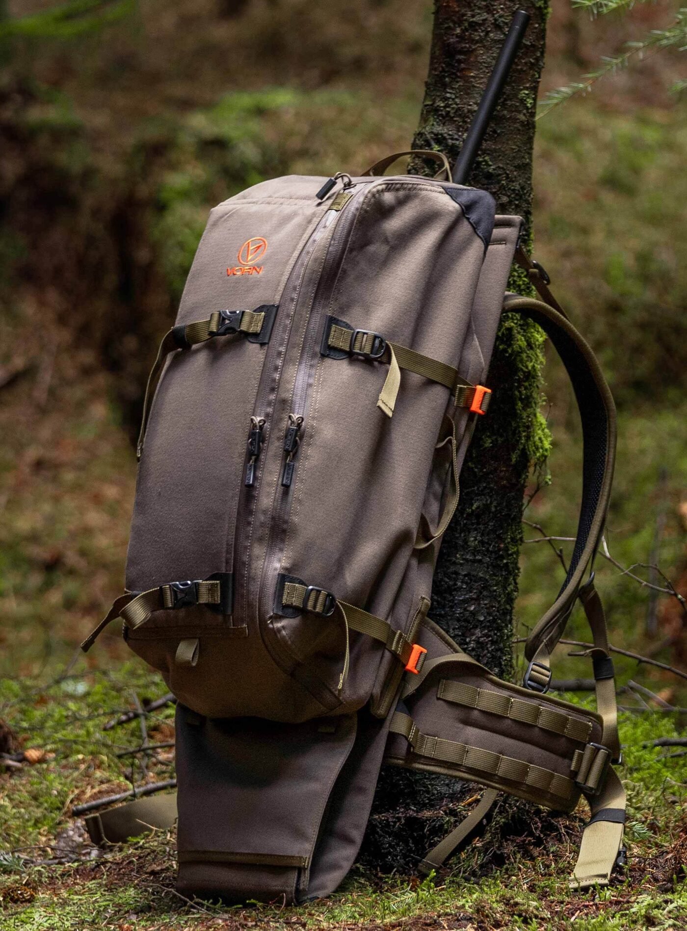 Keep the backpack on your right shoulder and pull it in front of you. Hold the rifle with your right hand and insert it with the scope facing forward. Attach the quick-release hooks and continue your hunt.