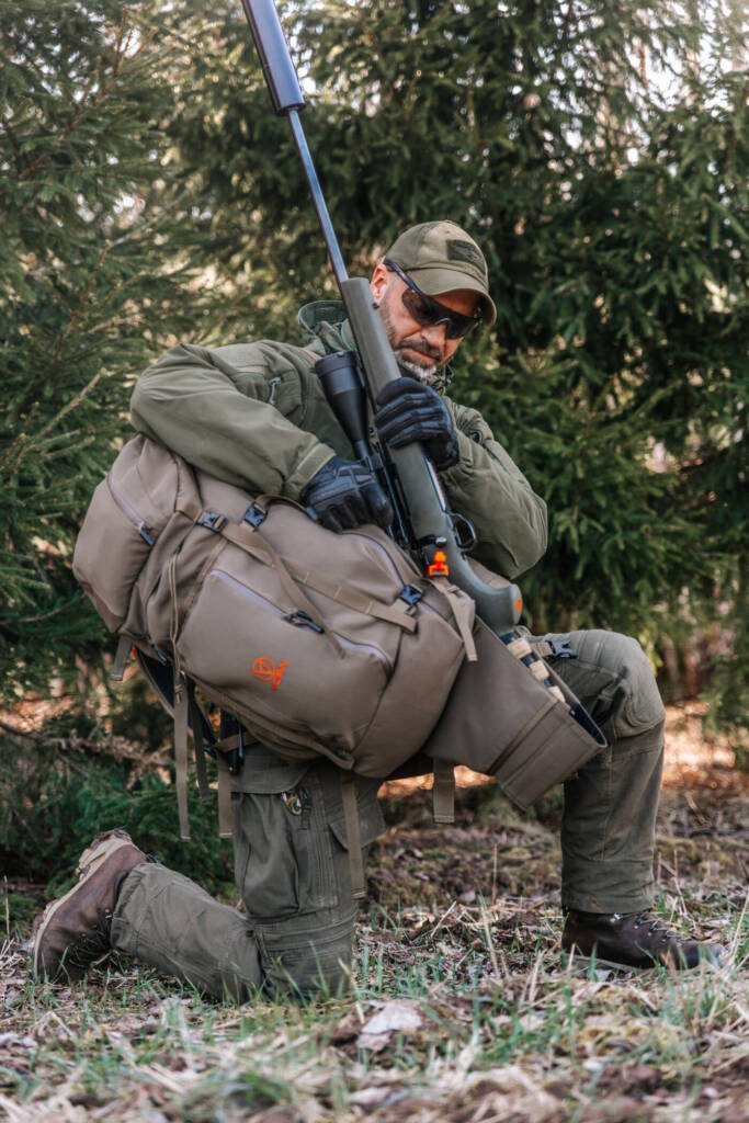 Paturiet mugursomu uz labā pleca un pavilciet to sev priekšā. Turiet ieroci ar labo roku un ievietojiet to ar tēmēkli uz priekšu. Piesprādzējiet ātrās atbrīvošanas āķus un turpiniet medības.